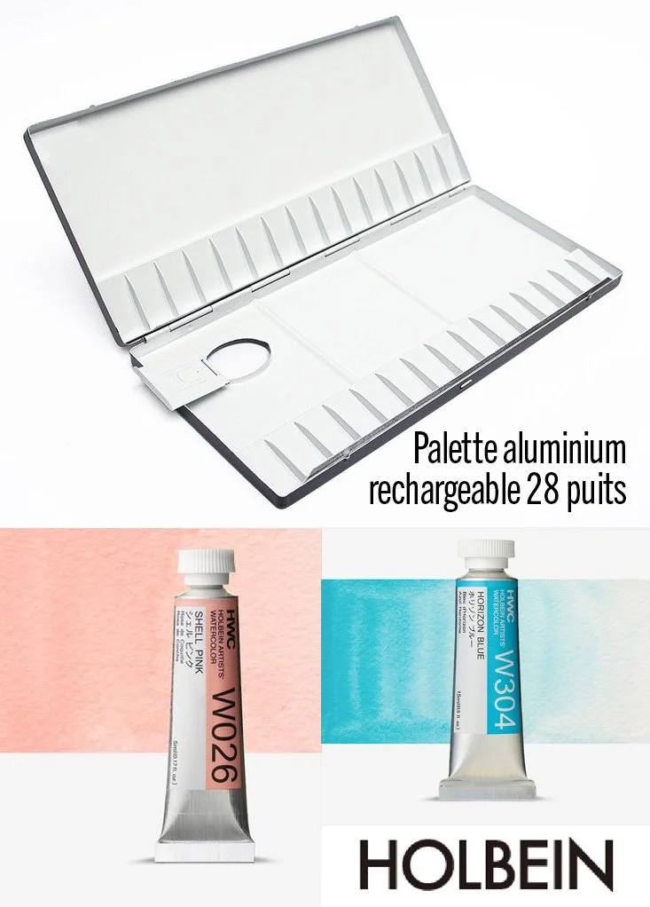 Réputées pour l’intensité et la pureté de leurs pigments, elles offrent des couleurs lumineuses, profondes et remarquablement stables dans le temps. Leur texture fine et soyeuse permet une application fluide, des lavis maîtrisés et un mélange des teintes d’une grande clarté. Elles sont vendues en tubes et HOLBEIN a créé des palettes à remplir, en aluminium avec une finition email noir et blanc, très légère et faciles à transporter
